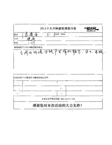 为促进建筑行业健康理性发展,畅言网在举办2010中国十大丑陋建筑评选活动后,2011中国十大丑陋建筑评选活动随即展开。为让更多建筑界人士参与到评选中来,畅言网特走进全国各大设计院,以期聆听来自一线设计师们的声音。以下是我们对上海建工设计研究院设计师们的采访,感谢大家的关注和支持。