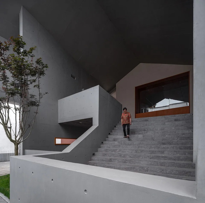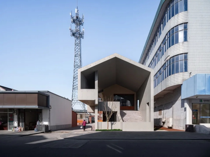 建成后的驿站是亭桥街道唯一直接沿街的公共建筑。不同于常规的商业界面,设计有意将书吧和茶吧功能后置,不直接暴露于街面。建筑立面变成公共空间的一部分,打开的立面成为人行步道的扩展与延续:开放的大楼梯朝向街道,既在平面上隔绝了外部车行对于一层活动空间的影响,又在垂直方向上指引至二层的书吧。立体的院落与平台交织于建筑的形体之中,成为街区立面上有趣的公共休闲空间。