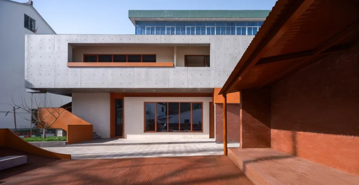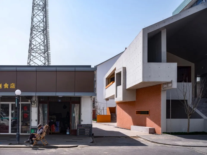 小院日常可供村民歇息或孩童们嬉戏,也可以作为一层茶饮的外摆空间。红砖材质的选用呼应了集镇上有着历史的水塔,留下一些传统生活与市井文化的印记。村镇定期会在这里放映露天电影,举办小型演出,丰富新亭桥集镇街道的文化生活。