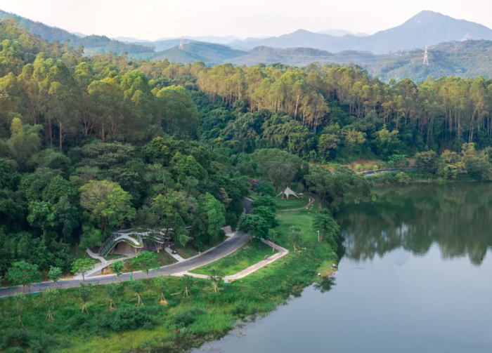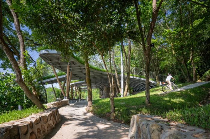 回想起来,整个设计的过程就是顺势而为。为了保留所有的树木和减少土方开挖,可以继续利用原有的两层台地,把在下层台地上的简易房屋替换为新建的驿站建筑即可。之前为了修建简易用房硬化地面,损失了山林绿色斑块,那就通过屋面种植来织补 —— 覆绿的屋顶如同从土地中生长出来一般,与上层台地的山林绿意顺接,像是山坡向着水面流动的绿色手掌。茂密的树林阻碍了凤谷驿的观湖视野,也遮挡了从环湖路观看凤谷驿的视线,那就让手掌的五指从树林的缝隙间探向水面,形成角度不一的观湖挑台,并使骑行者更容易注意到林间驿站的存在。手掌掌心拱起,为下部的小房子提供净高;指尖下垂,以避让低矮的树杈分支。