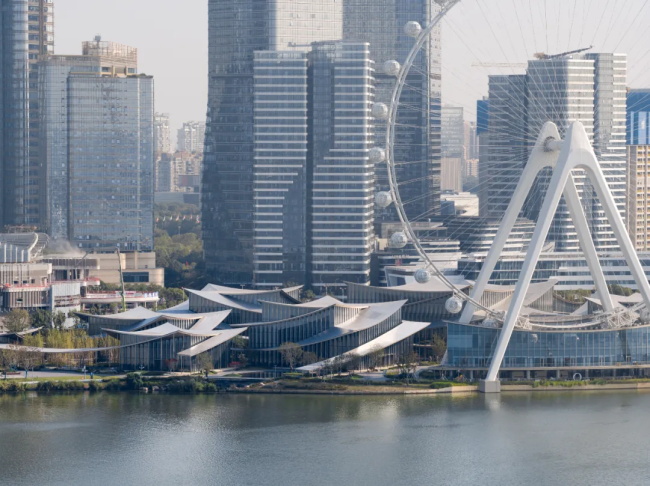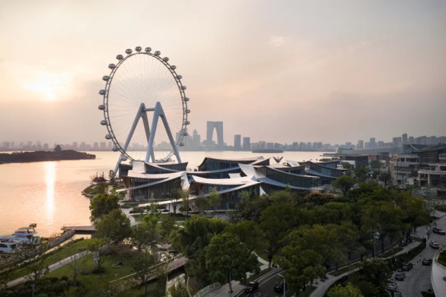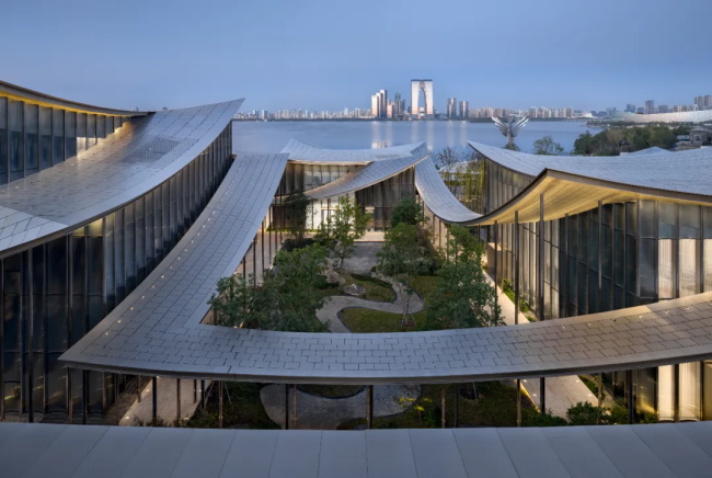 规整的城市肌理与自然蜿蜒的湖岸肌理在美术馆的用地处交汇,同时也是多条城市视线通廊的焦点。丹麦 BIG 建筑事务所充分利用紧贴水岸的绝佳地理优势,基于对苏州园林中“廊”、“亭”、“院”等元素的现代诠释,以分散体量沟通城市视线通廊,在城市与滨水之间,构建了一座“无边界的美术馆”。建筑布局与城市街道成一定夹角,自然形成不同尺度的户外开放空间。通透的有顶廊道引导访客在美术馆场域自由穿行,直至金鸡湖水岸并嵌入环湖滨水开放空间系统之中,带领观众踏上一场城市、自然与水域交融的艺术旅程。