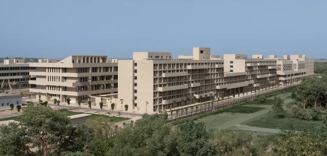 塔里木大学国际交流学院位于校园南侧用地,南倚塔河北侧连绵的胡杨林,北接公共教学楼与校园绿地,坐拥优越的自然景观。设计整合了教学办公、生活居住与文化交往等多元功能,为国际学生打造了一站式综合社区,形成了内向围合的学习生活聚落。