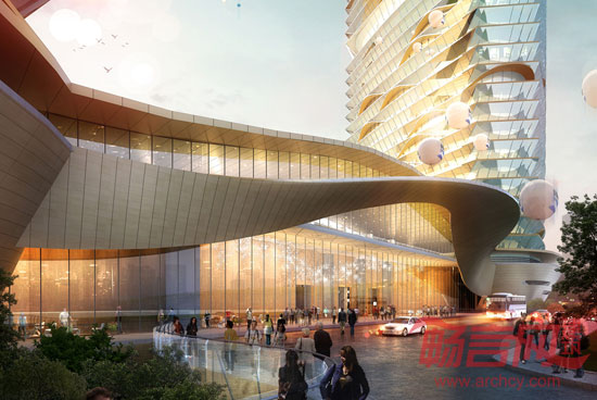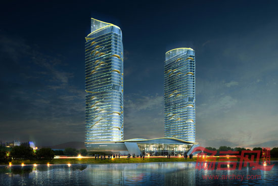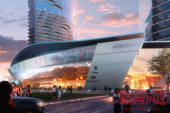 项目位于陕西省西咸新区世纪大道的轴线正中,距西安市中心23.8公里,距咸阳机场22.6公里,是一个典型的城市标志性建筑地段。咸阳会议中心布局分南北双塔,其中北塔为5A级写字楼,南塔为五星级酒店及酒店式公寓,中间裙房首层为商业餐饮配套,二层为1000人宴会厅及会议中心,与酒店及写字楼位于二层的餐饮空间联动,三层为酒店配套泳池,健身房等功能。