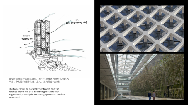 城市和建筑设计采用“逐级退台”的方式,将宜人的自然光线引入公共领域的各个层面。“多孔”的建筑立面促进自然通风,塑造了一个会“自然呼吸”的垂直社区。散发着自然气息,两层通高的空中花园和露台分布在整座建筑中,为使用者提供呼吸新鲜空气、亲近自然的机会和极目远眺处的山水胜景。