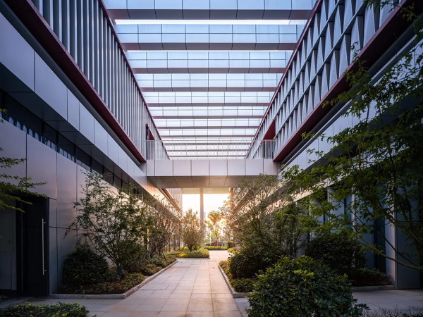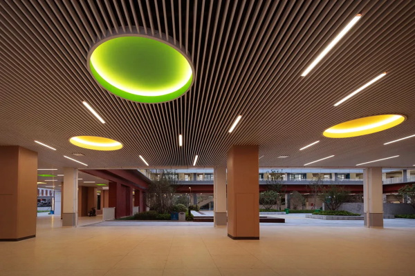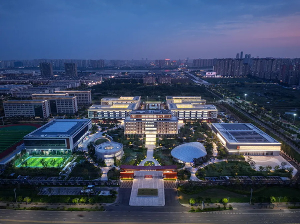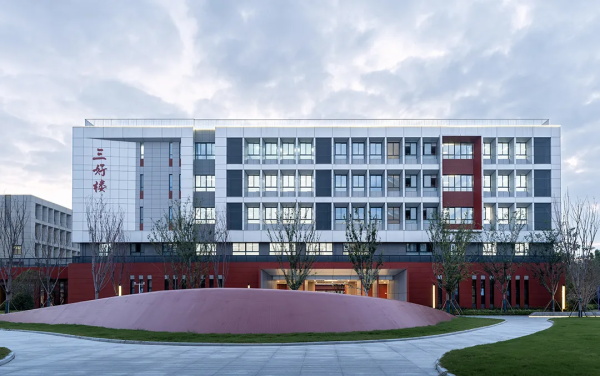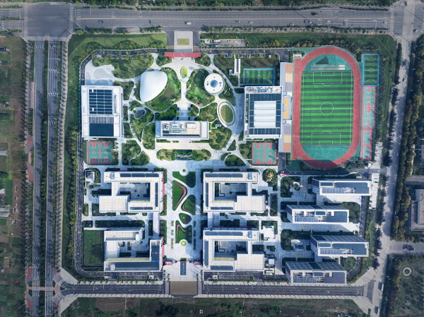 新校区主体规划架构以“秩序和艺术”为设计理念,南片区的教学组团和生活组团以秩序和理性为理念展开空间布局,教学楼以南入口为轴线东西对称布局,宿舍楼延续理性的布局原则错落设置于教学楼东侧。北片区的公共教学区采用艺术和感性的规划原则,礼堂、体育馆和综合楼三组建筑作为校园内的标志性建筑,坐落于校园中部,成为校园核心区域,形成强烈的向心性,整体展现出动态的空间关联。