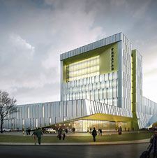 基地位于天津市武清开发区。项目功能定位为以服务创业型小企业独立办公为主,大中型企业集中式办公为辅的城市创业型总部基地。设计以“自然之城”为理念,强化规划构架,对格状进行拉伸、变形处理,形成网状肌理,将体量提升后丰富天际线变化。