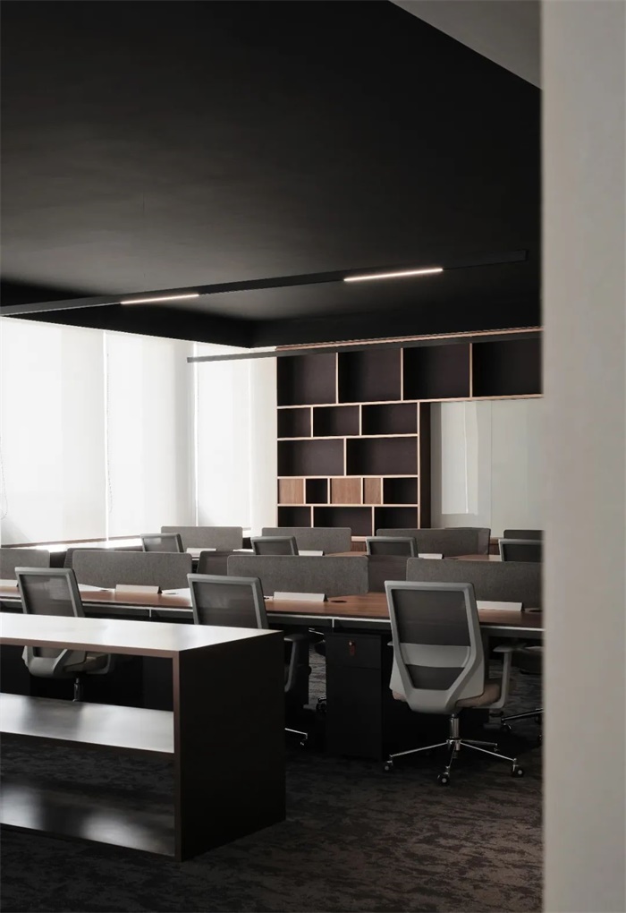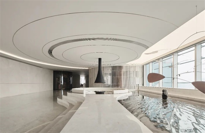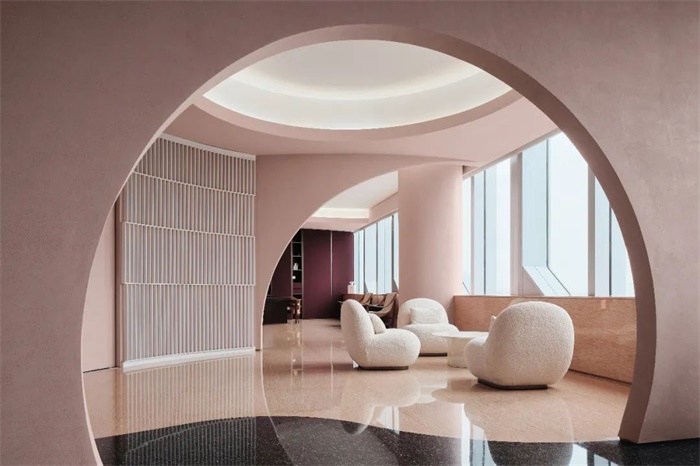 设计初始考虑两种不同使用的方法, 首先以功能划分出动静两种不同的视觉属性,顶层面向黄浦江的区域,在原始的方正塔楼格局架构下,让自由的弧形进入空间,弧墙交错之间,转换了原始结构的方形局限,形成了不同的社交活动空间;另一侧主要静态办公区,维持矩形的入口,内部大小会议空间动线分明,主次办公区进退有序。