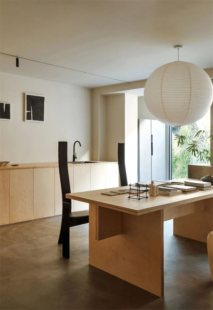 楼梯特意设置在室外,楼梯下的花池种植着蓝花楹和珊瑚树。进门左侧一组5.7米的通长书桌和三层层板构成了主要的工作台、书架、模型和材料样品陈列区,由桦木多层板采用原始的榫卯结构拼插而成。桦木板长桌构成了活动区洄游动线的中心点,这也意味着它承载着阅读、洽谈、用餐等灵活多变的使用功能。