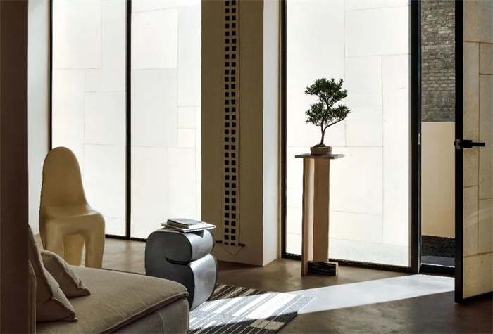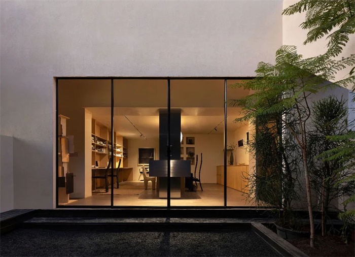 设计师首先整合了门窗的位置,将一层的入口外移,扩大室内面积的同时以四扇通顶的玻璃推拉门作为入口,最大限度引入自然采光。开放的一层空间作为工作和接待区,生活区则选在了采光和私密性更好的二层。
