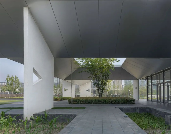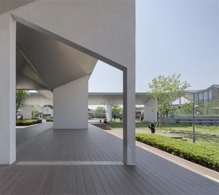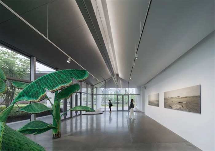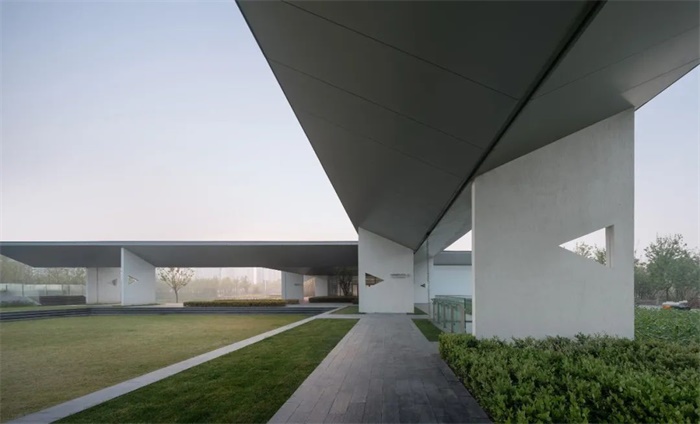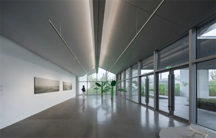 由于美术馆地处镇外,就自然构成了第一层里外关系:绿环里的美术馆独立于整个镇市之外。为了明确这种独立性,我们将美术馆的室内主体放在绿环的东侧,和镇东入口脱离约60米的距离,成为镇市与美术馆之间的缓冲区域。这段被有意放宽的边界好比当年甪直镇边与田野自然接续的那片场所,我们得以在这里经营入馆前的空间体验:对于从小镇走来的参观者,这个空间将提示镇的结束,绿地的开始,浮现美术馆的氛围,让人沉静心情,自然接续启步艺术之旅;对于美术馆而言,这个空间是参观体验的先导,是外在的气质,也是向外的扩展。
