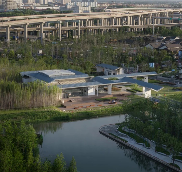2018年,瑞安在虹桥枢纽西边企划重建几为旧墟的蟠龙古镇,以步行街为核心,环以绿带公园,在其外围开发房产。山水秀接到的委托是在镇东绿环里设计一座美术馆。看了整个镇区的规划,我理解新的蟠龙镇是一个文旅商业聚落,风貌上再造出来的“水乡小镇”不可能再现社会生产意义上镇、田之间的互成关系,但规划图上镇外的一圈绿环仍然醒目,让我回想起当年在甪直镇外的那个早晨。我相信蟠龙古镇曾为稻米集市的历史,以及新镇边紧邻自然的场地环境,能够为这座当代美术馆提供独特的坐标。