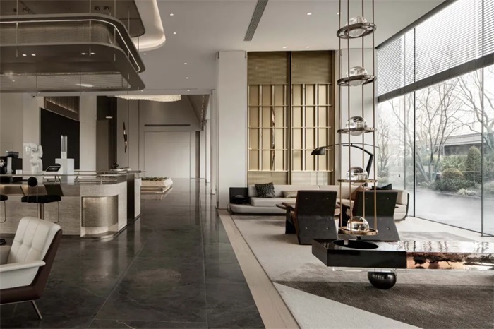 潮汐与天空的引力呼应,象征着新生不息的生活浪潮。沙盘区与接待区相连,10米高的悬挑架空形成空间界面的变化。设计以潮汐之力意象予以艺术化重构,超大体量的波浪造型艺术灯饰以阵列感和蜿蜒的形姿于节奏感中散溢出清透高雅的美感,使空间变得富于张力,亦成为空间的灵魂及视觉焦点。