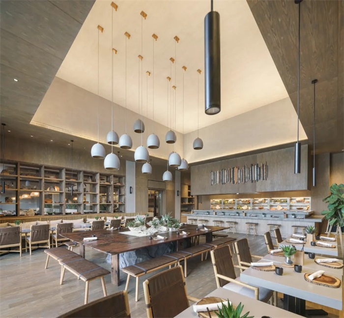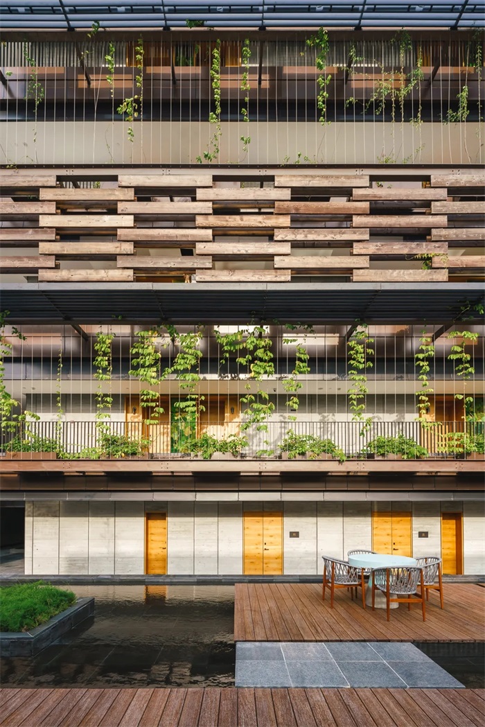 建筑风格同酒店定位相匹配,突出生态环保、回归自然的朴素理念,通过体型的转折变化,打造了形态错落、步移景异的建筑群落。外立面受到海南当地传统建筑的启发,并融合被动式环境设计策略,通过一系列遮阳和融合建构的景观绿化设计,使得空间层次丰富,光影变化细腻,富于体验感。墙体将暖色木料、耐候金属与源自本地火山石材等天然物料相结合,营造出质朴、自然的多样氛围。项目采用本地植被,营造出不同质感的墙体层次,以及错落有致的屋顶平台和大小不一的半开放式庭园。设计着重第五立面的打造:落客平台、裙房及客房屋顶均进行了详细设计,营造出不同质感的平面层次、错落有致的屋顶平台以及各式各样的半开放式庭园。