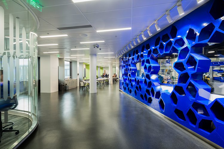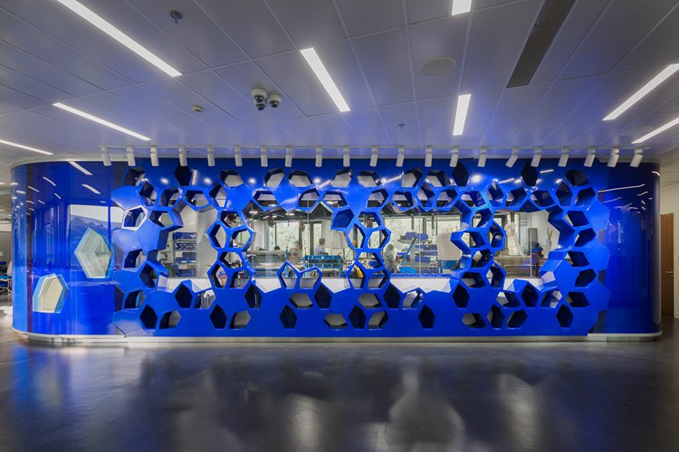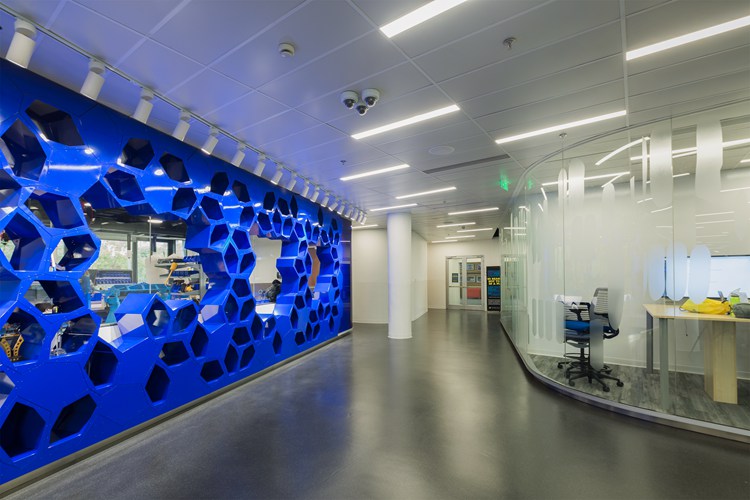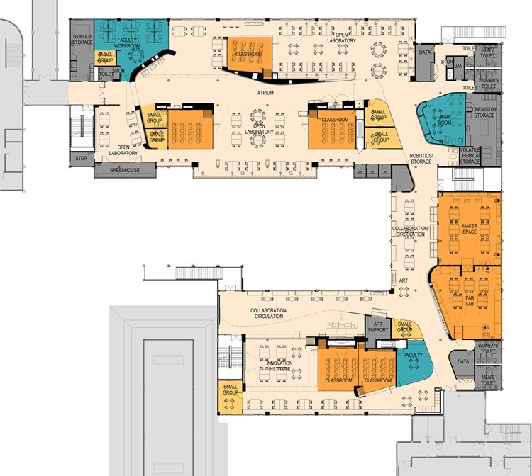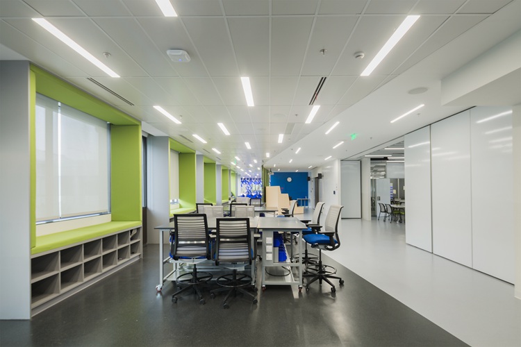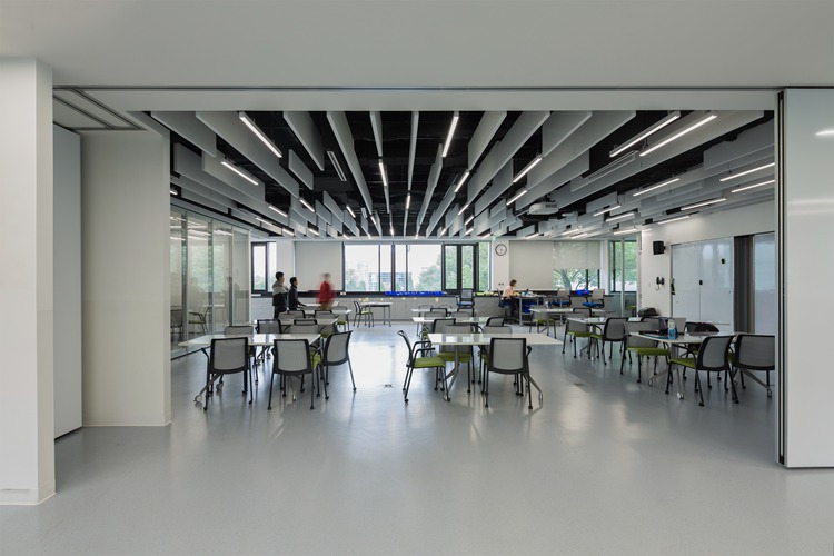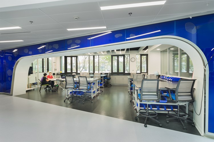 改造后的空间形成了多种多样的开放创新型的课业项目实验区和小组讨论区,制作区和模型实验室的资源与整个学校进行共享,鼓励学生将创意动手化为现实,并通过各种技术支持进行成果展示。创新研究区尤其将自然科学、数学、社会研究和英语等学科的教师聚合起来,与小型学生群体共同开展跨学科的项目专题学习活动。