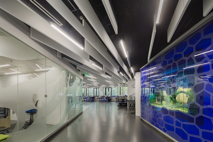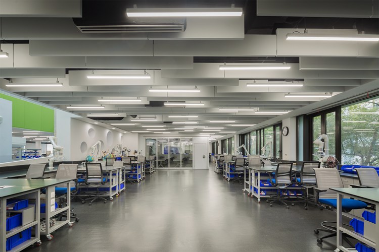 本项目将原有的3000平方米的“工厂模式型”传统教学空间打通为开放空间,在反向C型楼面上利用单边构成三大片区,分别是自然科学区、创作制造区和创新研究区。三大功能片区相互重叠,进而形成多重功能区,激发学生之间的互动联系和学科之间的知识联系。
