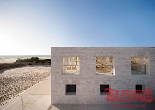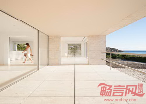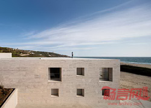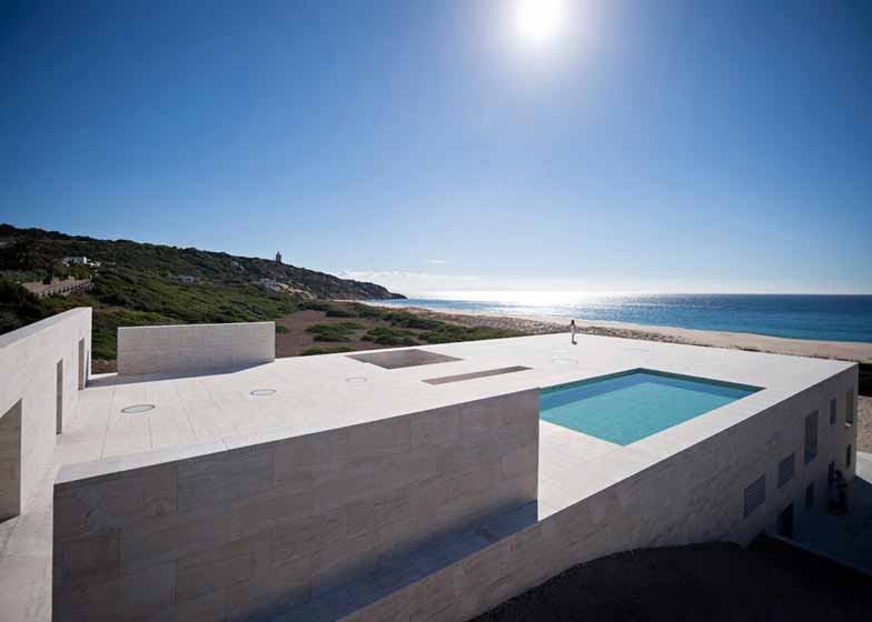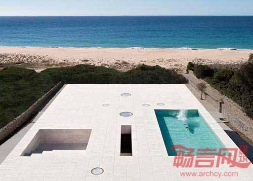 Alberto Campo Baeza设计了位于西班牙Cadiz海滨的VT住宅。建筑具有广阔的屋面,如同崎岖场地的平坦延伸结构。这座住宅起初被构想成景观建筑,所有建筑元素均为下沉式设计。设计师表示,“我们设计的住宅如同面向大海的防波堤。在平坦裸露的平面上,我们可以眺望遥远的时空。”建筑具有体积庞大的长方体,尺寸是20米宽、36米深,而上方露台给人的印象是空间比实际尺寸更大。屋面下方分别设有二层空间。两层楼面前端从陆地向海洋探出,后端则是向岩层凹陷12米。