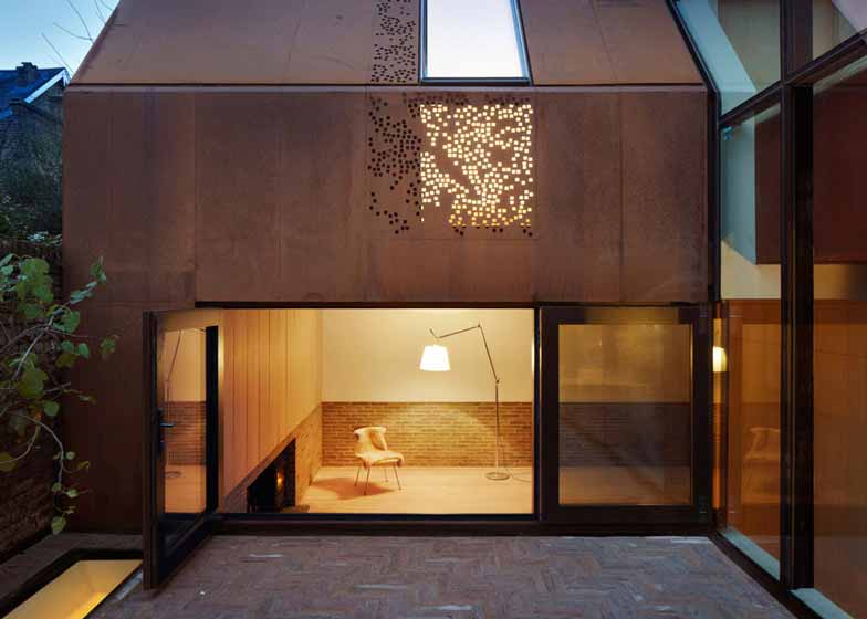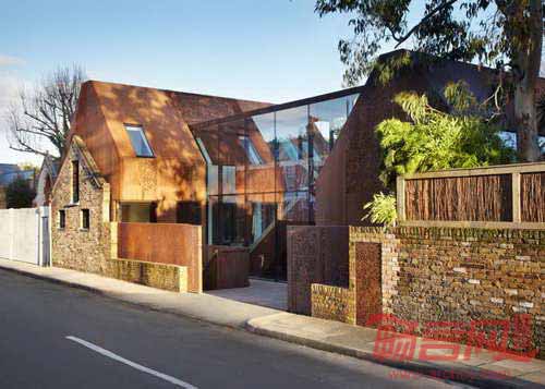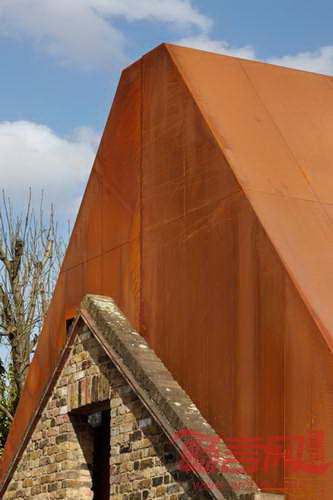 Piercy & Company建筑工作室设计了位于伦敦西南部的Kew住宅。建筑位于一座19世纪马厩墙面后方,形成中央玻璃楼梯、两端锈面山形墙的格局。项目处于Kew公园?;で?,三层建筑的设计旨在尊重周边建筑规模和尺度,同时为业主家庭创造宽敞现代的住宅。为了达到该目的,建筑师保留了年代久远的马厩墙面,并依照其形式复制了风格相似的两层副楼。建筑外部覆盖了未处理的钢板,提供同旧砖石建筑和谐的形式。部分窗户被钢板遮盖,表面有不规则穿孔,创造了采光和视野。