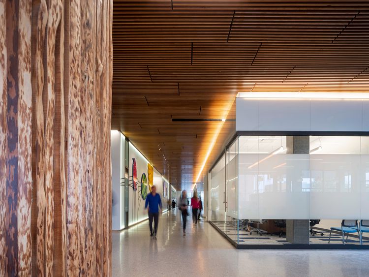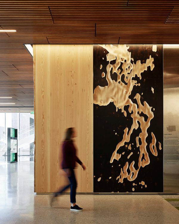 One of the design’s most unique elements is the elevator core, wrapped in custom-milled slabs from 200-foot Douglas fir trees. Designed to mimic the way the trees appeared in the woods, the wide base of the trees on the first floor progressively narrows and tapers as it rises to the floors above. The nine trees from a forest in the Olympic Peninsula were donated by Leopold-Freeman Forests, LLC, as part of Scott and Susan Freeman’s watershed restoration efforts described in the book Saving Tarboo Creek.