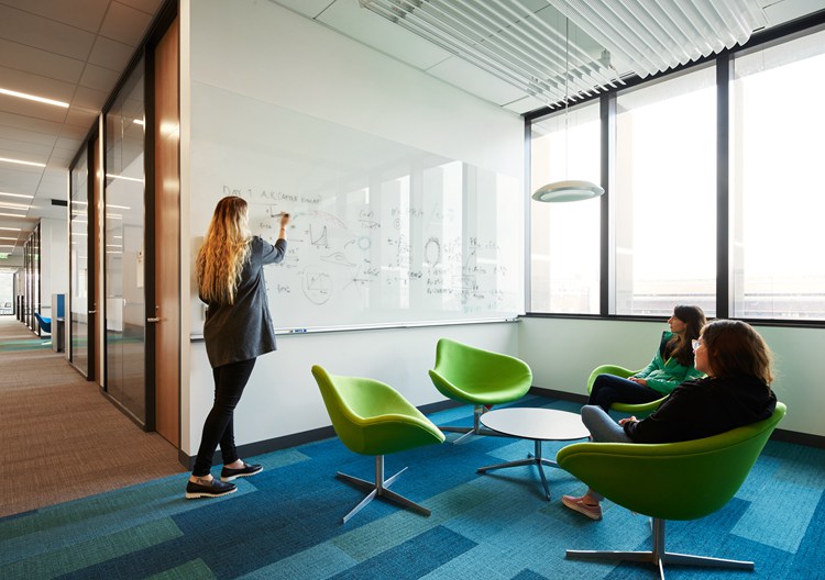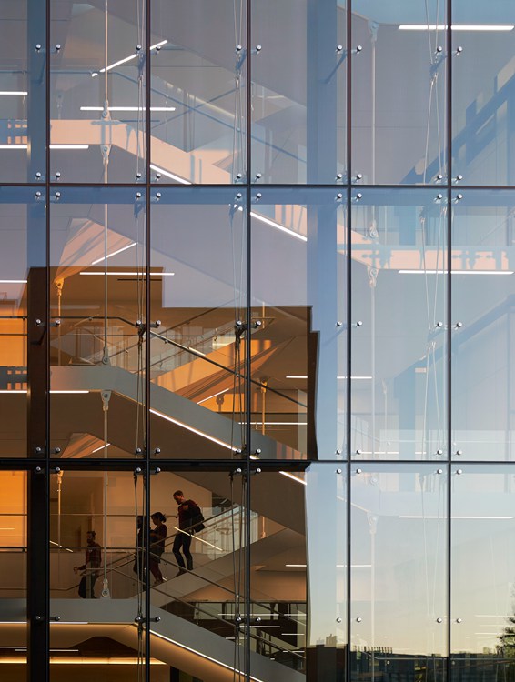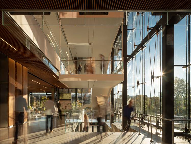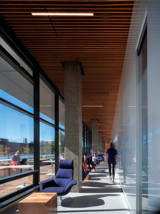 Designed for team-focused collaboration, offices, laboratories and common-use spaces are placed in close proximity to each other. Open, modular and flexible research and teaching areas are designed to be able to adapt to emerging research questions that require novel methods and new instruments. To encourage impromptu encounters, the interior features a suspended staircase with oversized landing areas; the exterior features a courtyard with cascading stairs and reclaimed wood benches along with a rooftop deck with seating adjacent to a cafe.