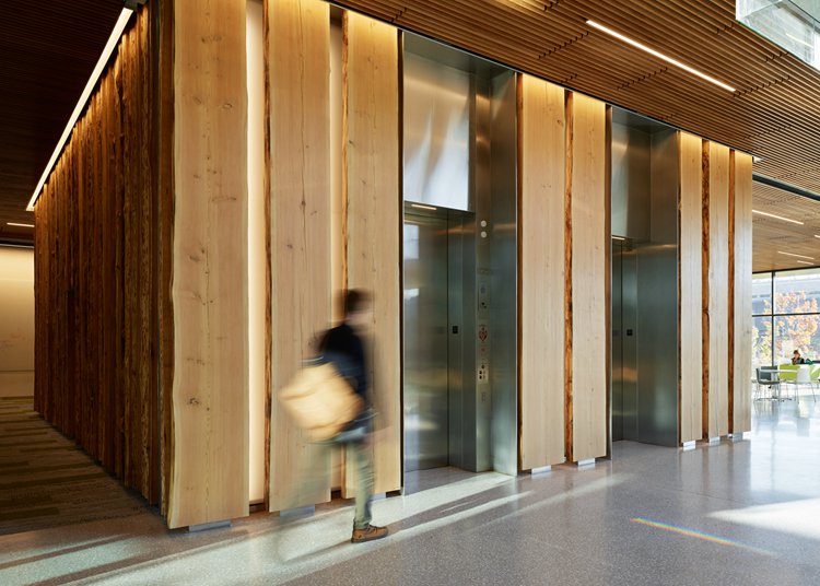 设计最独特的元素之一是电梯核心筒,它是由约60米高的花旗松经过量身加工的板材覆面而成的。设计着意效仿树木在森林里的天然状态,建筑一层的宽大树桩随着楼层的上升而逐渐变细变窄。作为覆面原材料的九根树木都来自于奥林匹克半岛,是由利奥波德·弗里曼林业公司捐赠的,意在响应《拯救塔波溪》一书中谈及的斯科特与苏珊·弗里曼夫妇发起的流域修复治理行动。
