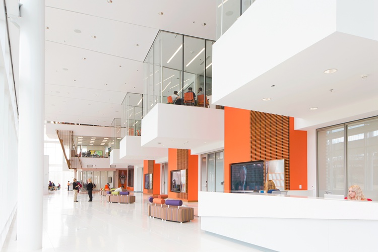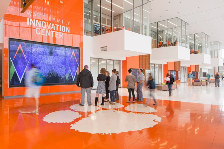 克莱姆森大学沃特家族创新中心最终成为了这一发展愿景的物质载体。这座由Perkins+Will设计完成的总建筑面积约6500平方米的创新中心建筑拥有73个结合音响技术的空间,354类硬件,4372个硬件产品,191个大屏幕高清触屏,12道视频展墙,1套影院级3D镭射投影系统,随同视频会议合作系统而设的4套网络体系,未来还将引进一座浸入式剧场。