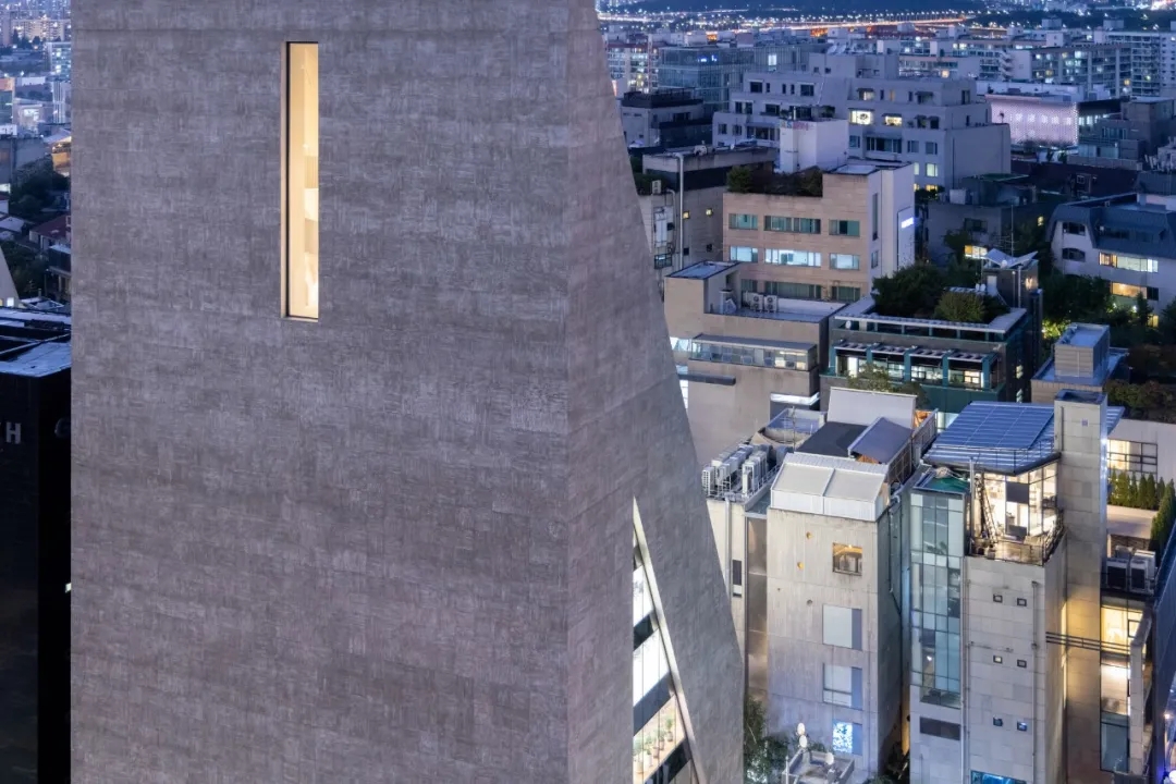 项目所在场地位于岛山大路(Dosan Daero)的最高点。岛山大路是一条穿过首尔南部清潭洞区域的主要交通轴线,以其坐落于这条路上的国际品牌旗舰店、餐厅及酒吧而出名。虽然这片区域主要由两或三层的建筑组成,但是土地使用分区规则规定,允许靠近主街道的建筑有更高的密度。在土地分区规定、区域快速转变以及岛山大路致密化的催化下,各种有着不同体量的建筑接踵而出,装饰着这条交通要道的立面。