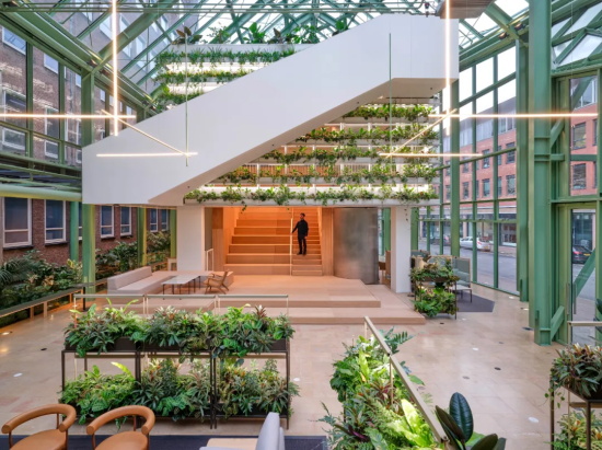 项目的挑战在于优化这些空间的多功能性,重点在于促进互动、协作与联系。此次改造的核心是引人注目的温室大厅(Orangerie)—— 一个充满绿意的空间,将两座现有的小空间及其周边区域重新构想为让人置身自然的、生动的交流场所。