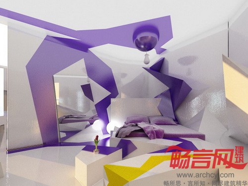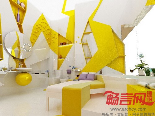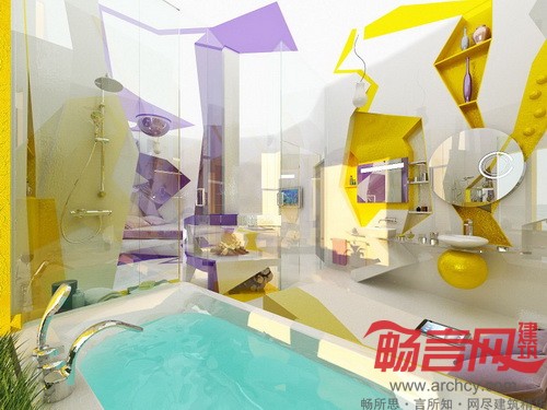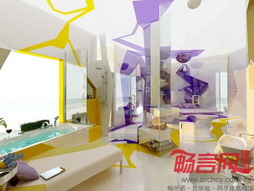 “这套设计方案涉及两个区域,一部分区域是卧室,另一部分则是浴室,两者之间是由壁炉和玻璃墙隔开的。我们的设计目的就是为了打造一个让人完全放松的环境。卧室设计选用的是能够激发人们想象力和灵性的颜色——紫色,而浴室的主色调则是黄色。整体看来,浴室就仿佛沙暴中的一片绿洲。”设计师说。