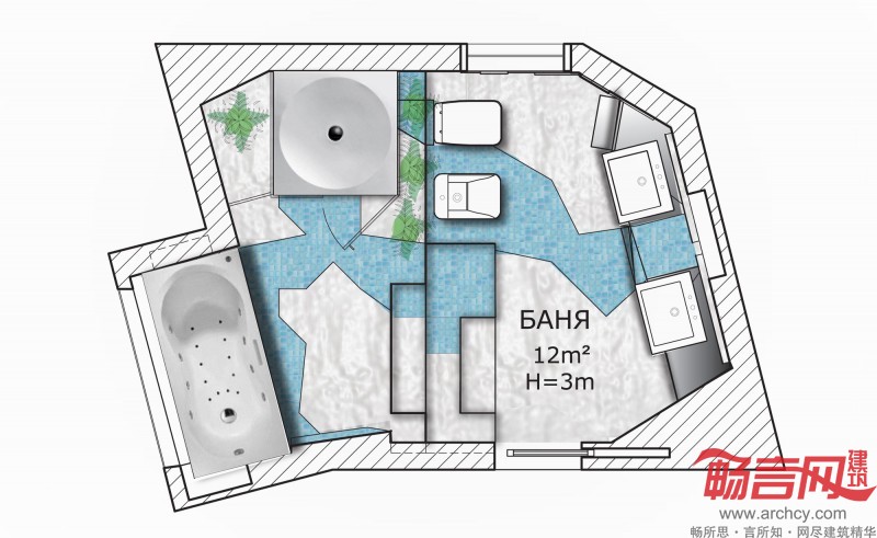 “对于一座房子来说,浴室是非常重要的一部分,因为它可能是主人唯一可以独处、放松、思考和幻想的私密空间,”设计师说:“在设计方案的创意阶段,水是首当其冲需要考虑的元素,因为只有水才能在主人与浴室之间建立起自然的联系。在生活中水通常是以液体形式存在的,当然也有固态和汽态的水。各种生命体都离不开水,水既可以清洁我们的身体,又是我们体内新陈代谢的基本要素之一。日本专家Masaru Emoto研究表明,水是具有记忆功能的,它能够吸收和存储周围的一些效应和变化,甚至包括我们的思想,因此,反过来思考的话,水也能够对我们产生特定的效应。因此我们将这个方案命名为‘水.几何’。”