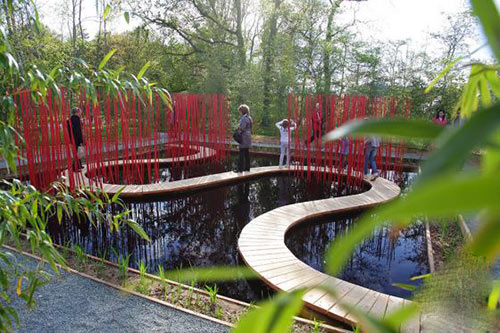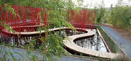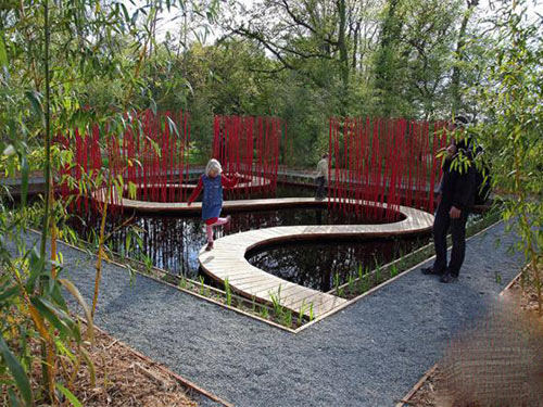 这个象征着大地与天空的小型雨水花园——“方与圆”,坐落于法国的 Château Chaumont,“天圆地方”是它通过曲线与方形等形式化语言对中国传统园林进行的重新解读,借助封闭式环境体验策略使得空间小中见大。该项目将当代雨洪管理理念与中国造园中关于人与自然的哲学思想相结合,并且为观赏和实施提供了一次亲密而愉悦的体验。