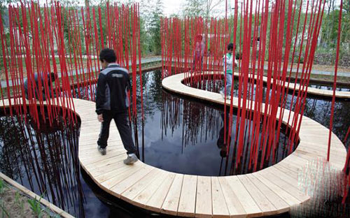 空间处理上,中国人习惯以小见大,形成了一种封闭式的景观,与西方开敞的、点至点的辐射式景观形成对比。方与圆的设计在生理和心理上都以一种全新的视角对中国传统园林进行了提炼。一个 9×9m的正方形雨水花园处于场地正中心,洼地减缓了周边的雨水径流。通过开挖和填充,栽植着竹子的池塘旁山体环绕,从而形成了一个密集的屏障,将其与外界环境隔开。中国的太极符号,传达着万物循环,生生不息的观念,年、月、季,甚至人类生命,正是由此激发灵感,设计中创造了一条弯曲流动的路堤将水面一分为二。通过两个看似反差的元素:方与圆,化冲突为互补,将理念整合。