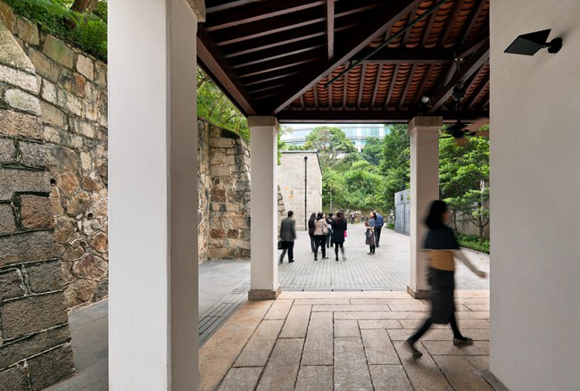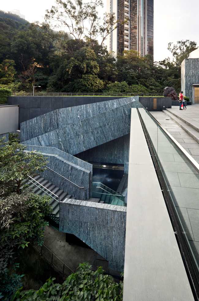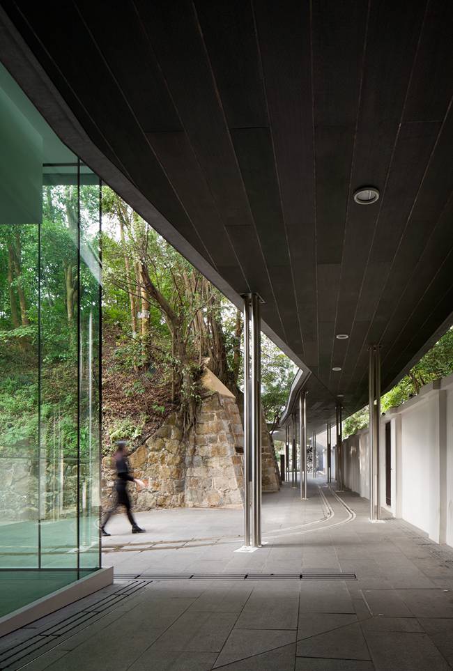 在场地下半部分位置,将上世纪40年代的建筑改建成了一座新的办公空间。一个新的两层楼的场馆建筑,在亚洲协会入口处的外墙上面包裹着中国南方特有的墨绿色石头。这里还有一个多功能厅,游客服务设施,礼品店和餐厅。外部楼梯通向屋顶露台。与香港的天际线形成平衡,它是安静的让人沉思的地方,并有着引人瞩目的的户外空间。