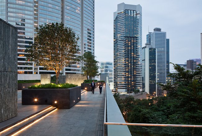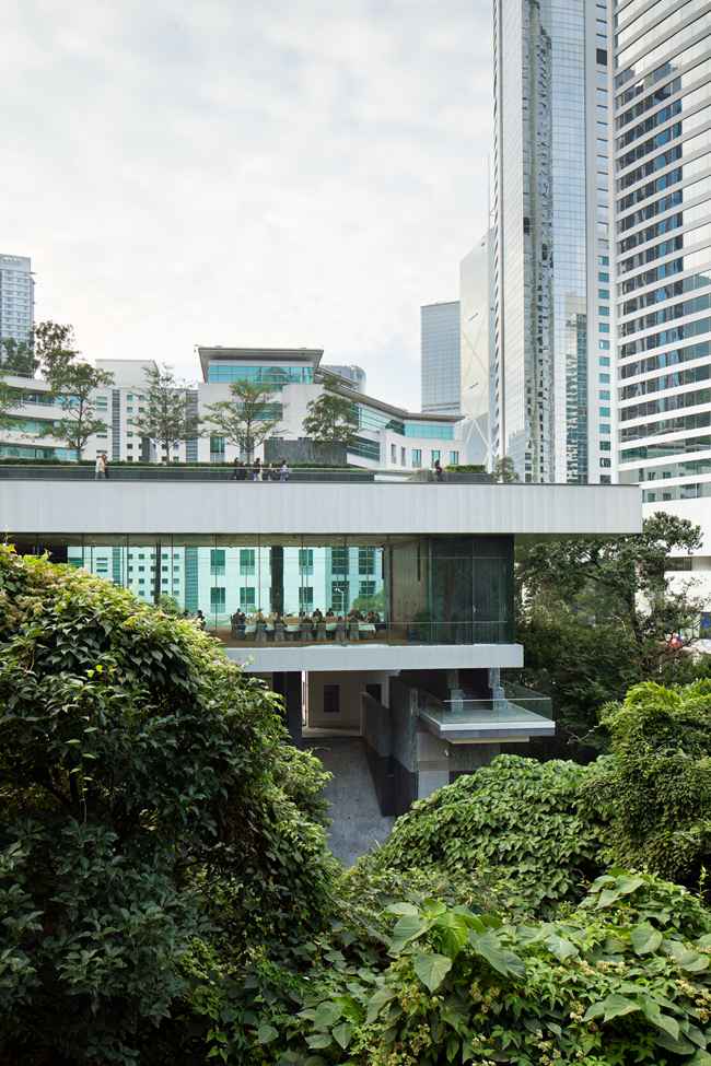 这座建筑面积为65,000平方英尺的摩天大楼四周为热带雨林。它横跨在两块绿地之间,中间是个峡谷。其中上面的部分是对古址的修复,两面石墙和用来隔离三个古文物建筑。他们曾经是英国用来制造军火的地方,其中建弹药库A建于1860年,现在被改造为亚洲协会美术馆。而同样建于1860年的旧实验室,现在成了亚洲协会的行政办公室。建于1905年的弹药库B,现在是一个包含了100个座位的剧院。其设计灵感来自中国传统的花园,在结构中间有许多覆盖的人行通道。新建筑在设计上 保留了许多原始建筑元素;维护设备被隐藏在下层,以保持这里原有的历史风貌。