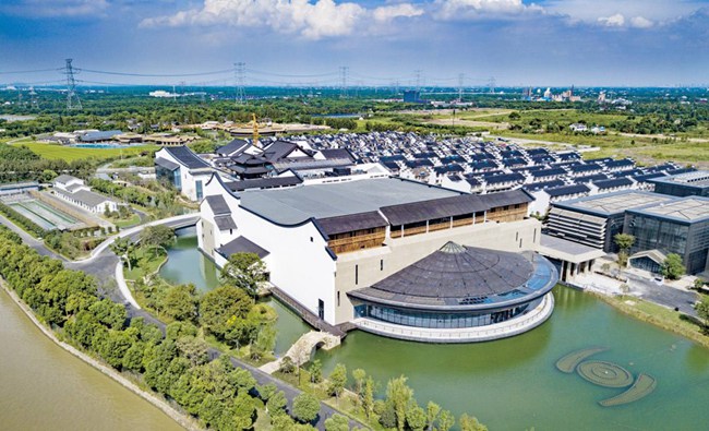 走进会展中心,像是进入古色古香的江南园林。白墙灰瓦、小桥流水,古拙的外立面让这座现代化建筑完美地融入了江南风景,而一些古建筑的上的木结构、青石砖等元素,也点缀其中。