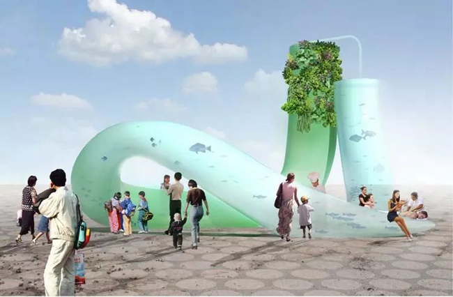 比如他们期望在 2009 年“深港城市建筑双城双年展”中实现的 Urban Aqualoop,一个用巨型玻璃管构筑的公共空间。这个公共装置的造型十分奇特,玻璃管贴地的部分呈圆环状,一端从地面微微抬起、形成一道“拱门”,与“拱门”相对的另一端,则是玻璃管向空中延伸的两处开口。位于高处的入口中种满了水培植物,位于低处的入口用于鱼类养殖,将它们连接在一起的水管会不断从低处抽水补给植物,不同品种的鱼类则在玻璃管中自由地移动。