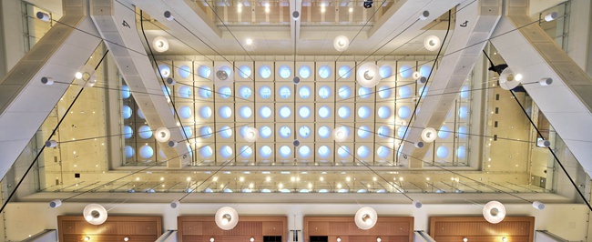 这个5500平方米的空间是由三个心房组成,其中一个是大型中庭(64米×16米,前四层较大)和南北两个较小的心房(16米×16米),并且高度就为建筑的高度,白天日光从上面屋顶露台上的天窗倾泻而下。随后的各楼层循环区域都会进入心房。从地面向上看,可以看到建筑物的釉面栏杆和开放式结构,还有一系列沐浴在自然光线下的长廊。