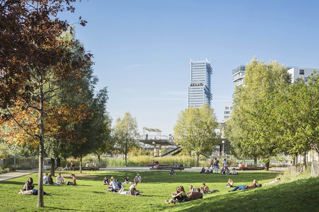 这个建筑是由四个大小不同的体量叠放在一起的,第一个体量长而低,与巴黎豪斯曼建筑的比例相一致。后面的三个体量每个都大约包含十层楼。这种分层结构会产生大型的屋顶露台——总共大约有一公顷的面积,并计划在这些露台上面进行园林美化,种植大约500棵树,这会让建筑变得更加的柔和,并创造出了舒适的空间用于人们在此思考问题和讨论事情。