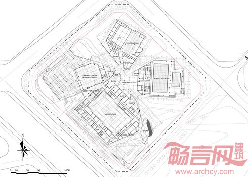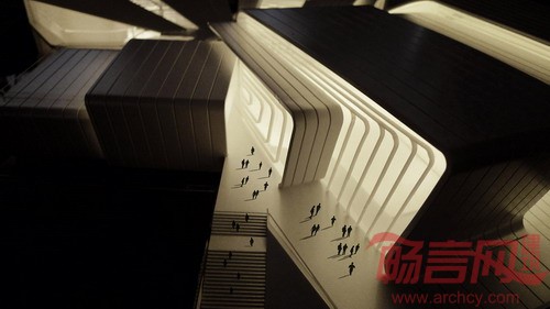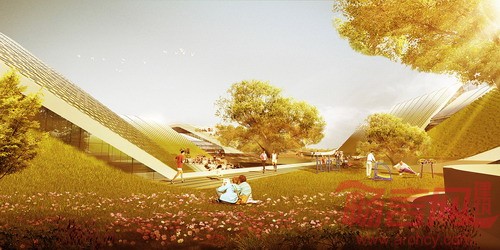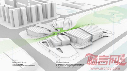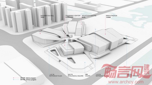 建筑设计引入生态建筑的设计概念,通过中央”山谷”的置入把各个场馆区统一成一个整体。”建筑中心位置的”山谷”本身是一个立体生态公园,多向性的活动流线在这里创造出各种富于活力的空间。”山谷”的一侧设置了面积适中的活动区域,可以成为户外表演场地,场地一直延伸至屋面,形成对应表演场地的观众席。作为”山谷”的立体公园的首层部分可以在炎热的夏季提供阴凉环境。“山谷”本身的开放性设计创造了多功能空间灵活植入的可能性,让这成为锻炼,休闲,餐饮,商业等等的市民聚集场地。