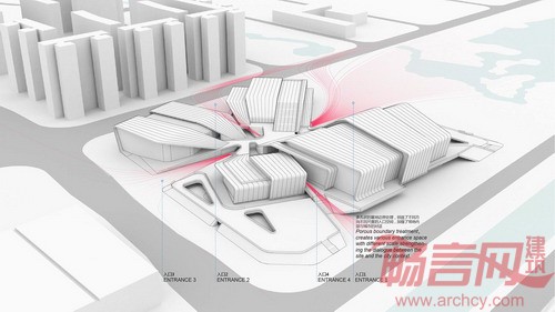 发散性的总体布局创造了一个富于渗透性的基地和城市交界面,同时形成各种尺度的活动场所,这些场所布置在不同的高度,适应各种类型的户外活动要求。