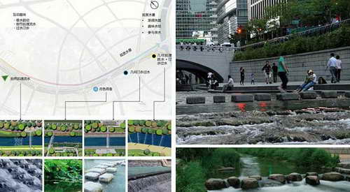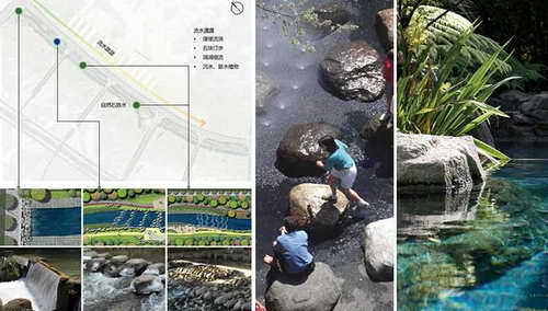 1)竖向关系复杂,道路与水面标高最大相差7m; 2)上游至下游存在丰富的水位变化,为了满足防洪泄洪要求需设置多处滚水坝。设计利用竖向变化创造多样的跌水景观,形成涓涓细流和小激流的趣味变化。