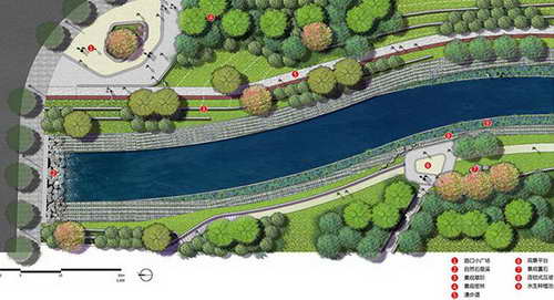 长沙梅溪湖肖河滨水景观带位于梅溪湖片区西侧,总占地76000平米。景观设计遵循生态原则、功能原则和美观适宜原则,对原有生态条件尽量减少破坏,通过生态手法净化肖河水质,满足防洪泄洪的要求,对水景进行专门的设计,从多感官角度打造丰富的水景效果,提供一条适合市民活动休闲的绿色廊道。