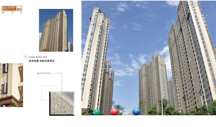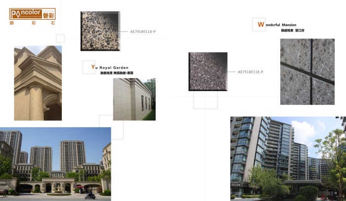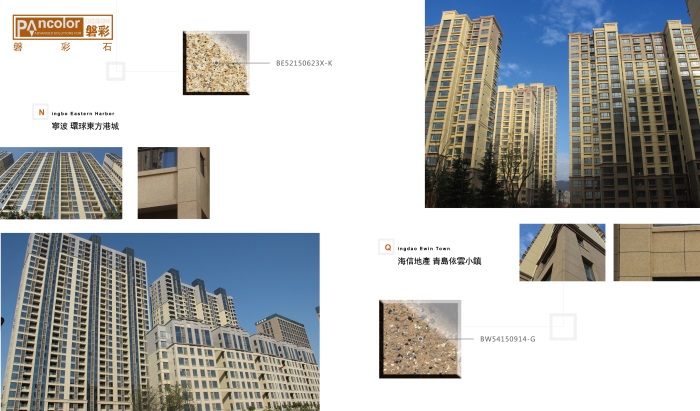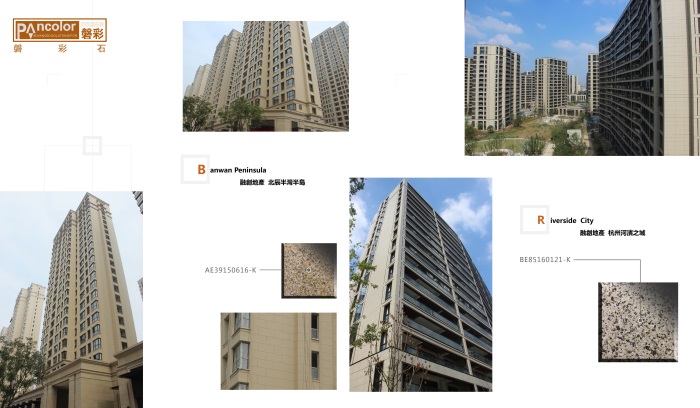 磐彩自成立以来,凭借其掌握多彩花岗涂料的核心技术、稳定的产品以及完善的服务机制,一直是多彩仿石行业的知名性企业,产品也多应用于精品、高档楼盘的建筑外墙及幕墙材料。磐彩拥有上万个成熟的成功案例,实操高仿的石材近30000种,并建立了全国最大仿石涂料数据库。
