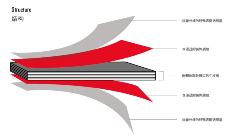 结构:包含芯层与表面装饰层,芯层主要是原生木纤维纸张含浸酚醛树脂。表面装饰层经特殊处理而成,再用钢板经由高温(150℃)高压(1430psi)的环境压制而成,厚度从1.5mm到30mm皆可制作,并且可满足多种花色选择以及单面或双面的装饰需求。