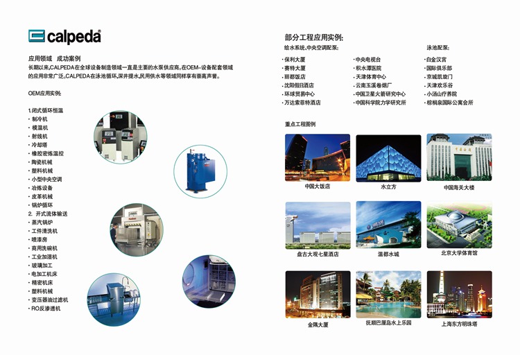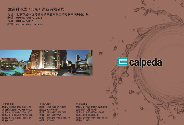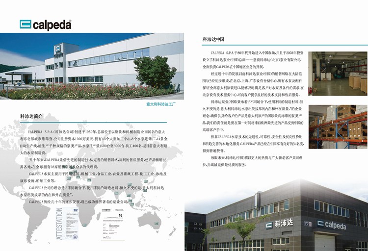 科沛达公司创建于1959年,历经几十年的逐步发展,现已成为世界著名的泵业公司??婆娲锕咀懿课挥谝愿痔突抵圃煲刀琶囊獯罄辈砍鞘形俨?(VIC ENZAR),下设有一个科研发展中心,八个水泵制造厂, 一个铸造厂及数家控股制造公司,能生 产近千种规格的泵类产品,员工近千名??婆娲锕驹谌澜缬涤?8家销售公司及众多的代理商;其高质量的泵类产品,先进的制造技术,完善的销售网络,周到的售后服务,使其产品畅销世界各地数十年,年产量在百万台以上。 科沛达泵业(中国)秉承着:“不同场合下,使用不同的制造材料,恒久不变的是:意大利科沛达水泵出类拔萃的内在和外在质量。”的企业理念。确保供货给客户的产品是意大利原产的国际最高标准的泵类产品,我们的责任就是要在第一时间将来自欧洲最先进的产品交到中国的高端客户手中。 科沛达产品的应用领域极其广泛,主要用于民用建筑工程;机械钢铁工业;食品工业;农业及灌溉工程;游泳池及康乐设施;普通民用;化工; 船用等领域 科沛达泵业(中国)成立后,其销售网络在中国范围内已经形成,中国境内在北京;上海;广东等地设有仓储中心,能够及时满足客户对水泵及备件的需求。并成立有技术服务中心,可向客户提供良好的技术支持售后服务。依靠CALPEDA水泵技术的先进性、可靠性、安全性及优良的质量—价格比和日趋完善的本地服务,CALPEDA产品已经在中国享有良好的知名度,得到普遍赞誉。