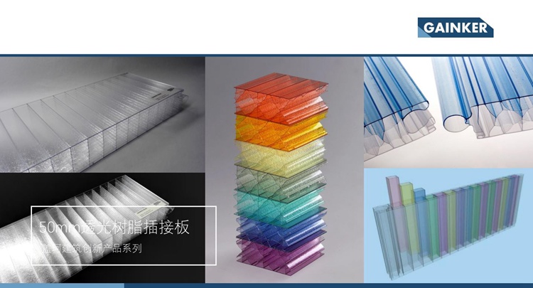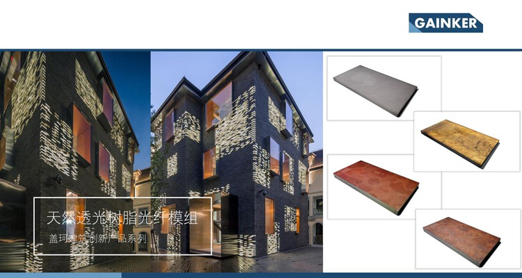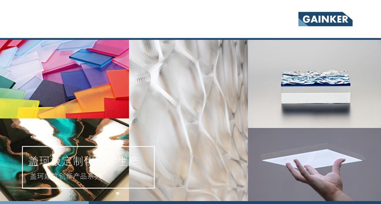 盖珂板和盖珂建筑外立面系统是GAINKER盖珂建筑科技旗下产品的注册商标。盖珂板产品涵盖了如下几类主要树脂系列:Polycarbonate(聚碳酸酯树脂)、Acrylic(聚甲基丙烯酸甲酯树脂,俗称亚克力)、Co-polyester(共聚聚酯树脂)、环氧树脂、丙烯酸复合树脂等等,并且每年还在持续创新更多不同种类的树脂材料在建筑领域的应用。