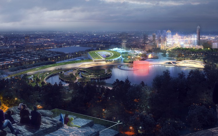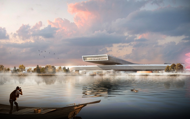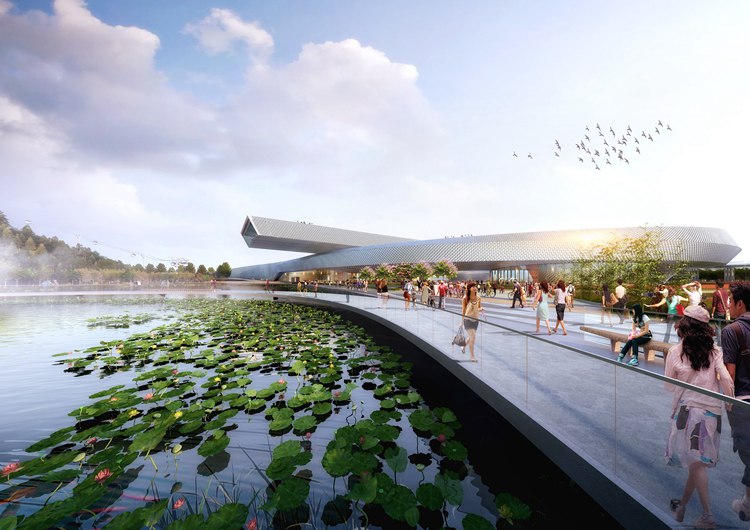 展馆的设计概念将这座城市作为长江沿岸重要商贸中心的历史传承 – 也被誉为“东方威尼斯” – 与折射城市现代创新潮流的现代风貌融合到了一起。带状的建筑形态从狮山脚下显露出来,继而向上扭转攀升,随后又摆首回望,并继续越过狮山湖岸和成群的小岛,悬浮在湖面之上,重新回到山体的怀抱,形成了一座从自然延伸到科技,最终又回归自然的令人难忘的标志性建筑。湖体本身将包含若干个泪滴状的人工绿植生态岛,通过步道与展馆相接,充当湖体的过滤系统,并为人们带来探索环境和科普学习的机会。