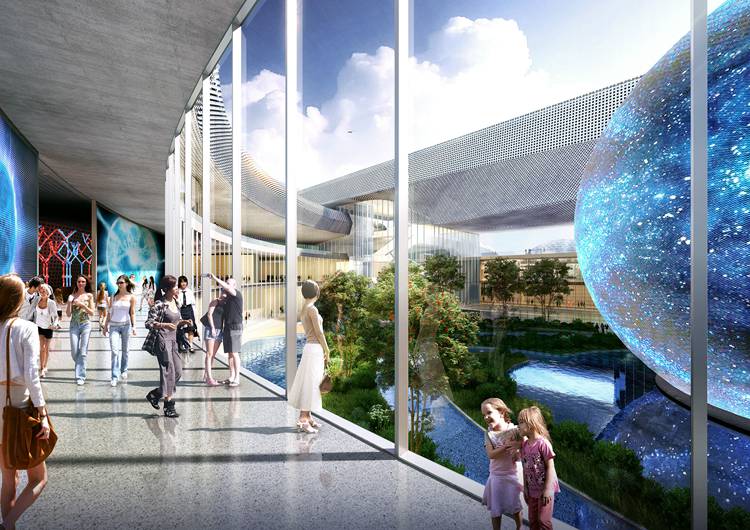 - 访客可通过多种方式到达展馆。搭乘地铁而来的人们从环绕公园的环形景观大道缓坡开口一路前行,在阶梯露台与涓涓溪流的引导下即可到达。自驾或乘坐公车的人们将穿过“发现园”这座配有投影池和聚集空间的仪式性广场到达展馆,同时还有机会窥见建筑内景。人们一走进建筑入口,眼前便会呈现出展馆标志性的特色要素,即一座三层高的中庭,与之相邻的是下沉式水景庭院,庭院包含若干个景观绿岛,与狮山湖上的生态岛形成共鸣。