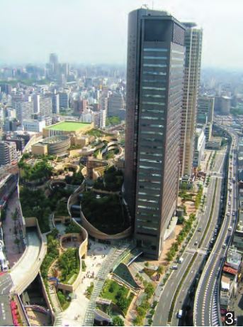 进入21世纪,日本的屋顶绿化事业得到了快速发展,施工技术、政策措施已逐渐趋于成熟 [5] 。日本大阪的难波商业城就是日本屋顶绿化事业发展的代表,难波商业城以屋顶绿化为特色主题,通过其屋顶绿化的规划设计实现了建筑与自然生态的完美融合,依靠其鲜明的特色取得了巨大的成功,成为大阪市特色的新门户。难波商业城沿着一座30层的高塔建筑层层推进(图3),整个建筑从地面到8层都设置了屋顶花园。从远处看,它是一个斜坡公园,从街道地平面逐渐抬升至8层楼的高度,屋顶花园将树木、岩石、瀑布、池塘、溪流等各种景观元素融入其中,设置不同层次的驻留空间,形成立体化的活动场所,满足人们的猎奇心理,为购物者增添了游览的乐趣。屋顶绿化与建筑设计的融合促使难波商业城成为日本开发最成功的城市综合体项目 [8] (图4、图5)。