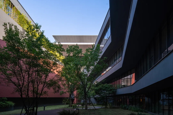 设计从整体环境为切入点,梳理整体竖向高差关系,利用场地与河岸10米的高差,采用下沉的设计手法,弱化建筑体量,让建筑消解在用地与绛溪河水面之间。