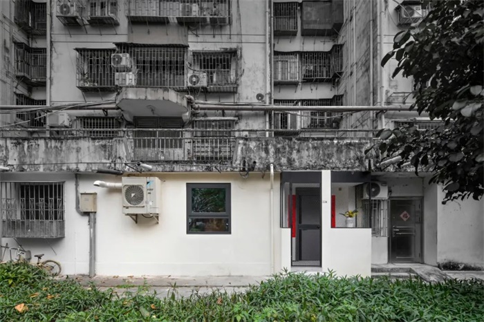 这是一个位于深圳老旧小区住宅楼一层的房子,建于1984年。第一次见它的印象:小面宽,大进深,昏暗,潮湿,自然采光通风都不太好,多处肉眼可见的漏水